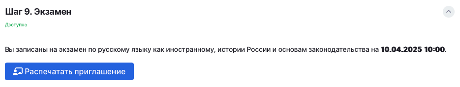 Распечатать приглашение можно на шаге 9 в личном кабинете по кнопке "Распечатать приглашение" либо из письма, приходящего на почту за сутки до экзамена, по аналогичной кнопке.