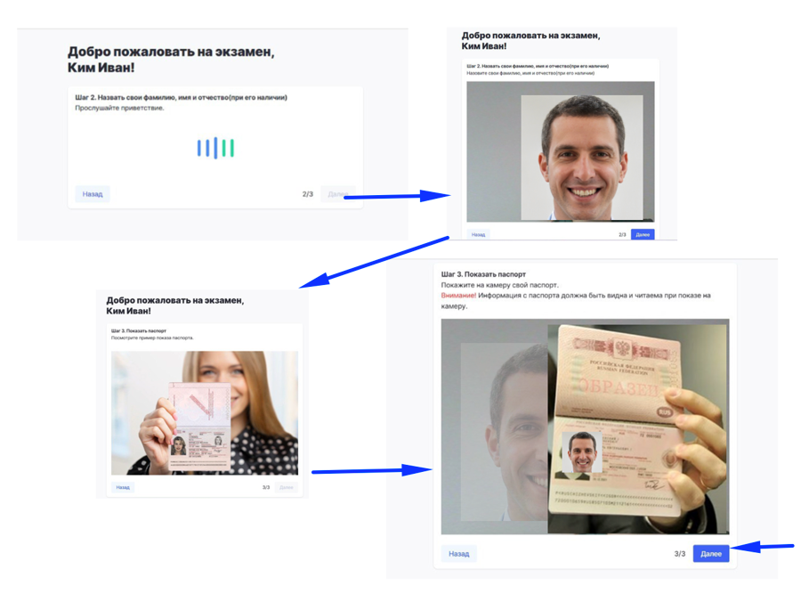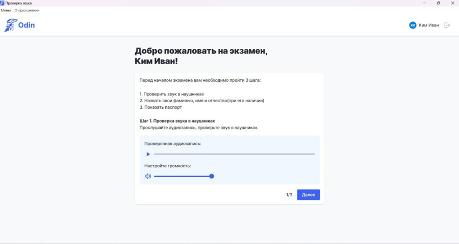 Проверьте, что в правом верхнем углу ваше имя и вы хорошо слышите в наушниках, затем нажмите "Далее" | ![]() |